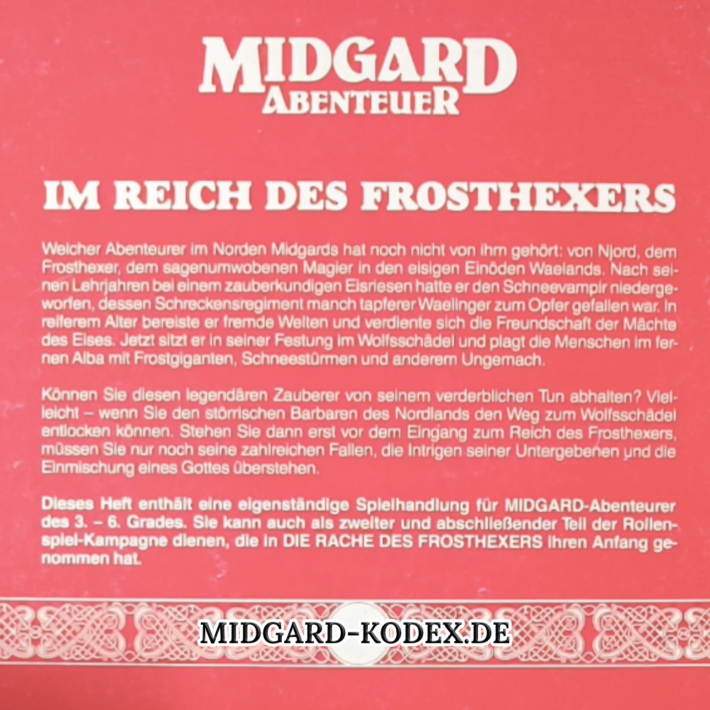 Der Band hat einen Umfang von 40 Seiten, ist ein Softcover (Klammerheftung) und gilt, wie alle alten MIDGARD-Publikationen, längst als vergriffen. Entstammte das Abenteuer „Schatten der Vergangenheit“ in „Die Rache des Frosthexers“ aus der Feder von Heinrich Glumpler, so wurde „Im Reich des Frosthexers“ von Rainer Nagel sowie Jürgen E. Franke verfasst. Das Abenteuer ist auf der Fantasywelt Midgard verortet und für drei bis fünf Abenteurer der Grade 3 – 6 gedacht. Als Altersangabe wurde 16 Jahre angegeben.